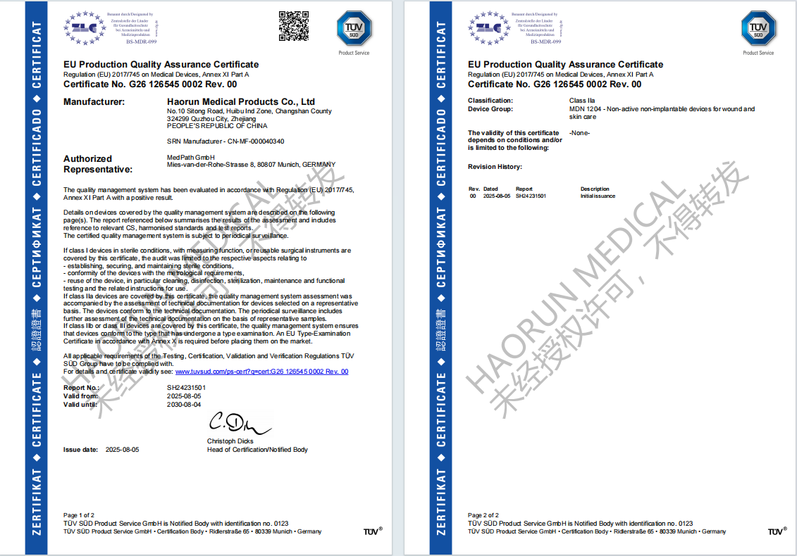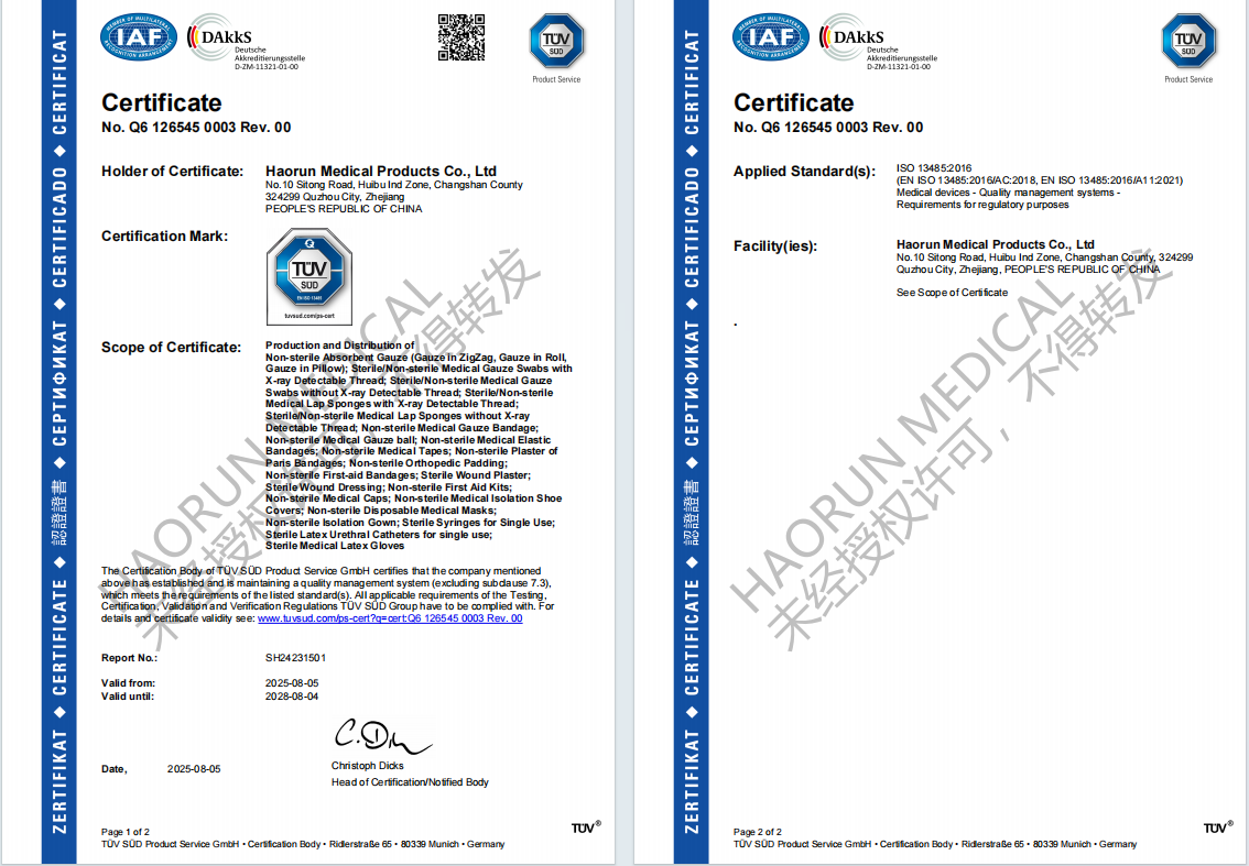 गुणवत्ता को और बढ़ाने के लिए, हमने सितंबर 2023 में अपने गुणवत्ता मैनुअल और प्रक्रिया दस्तावेजों के प्रकाशन को पूरा किया। इसके आधार पर, हमने जनवरी 2024 में अपने गुणवत्ता प्रबंधन प्रणाली के दस्तावेजों को बढ़ाया, एमडीआर-संबंधित सामग्री को जोड़ा। हमने 10 अप्रैल, 2025 को TUV SUD ऑडिट का पहला चरण पारित किया और फिर दूसरे चरण में। अंत में, इस वर्ष के अगस्त में, हमारा प्रमाणपत्र संख्या अधिसूचित निकाय की प्रणाली में देखने के लिए उपलब्ध हो गई, होरुन मेडिकल की गुणवत्ता प्रबंधन प्रणाली में एक नया कदम आगे बढ़ा और विकास के लिए कंपनी की नींव को मजबूत करने के लिए। हमारे डिस्पोजेबल मेडिकल कंज्यूम्स (धुंध, धुंध रोल, धुंध पट्टियाँ, आदि) बेहतर उत्पाद गुणवत्ता और सेवा के साथ दुनिया भर में ग्राहकों को प्रदान करते हैं।